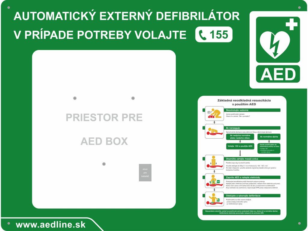 ● so zobrazením medzinárodného znaku pre AED a tiesňové linky "155"